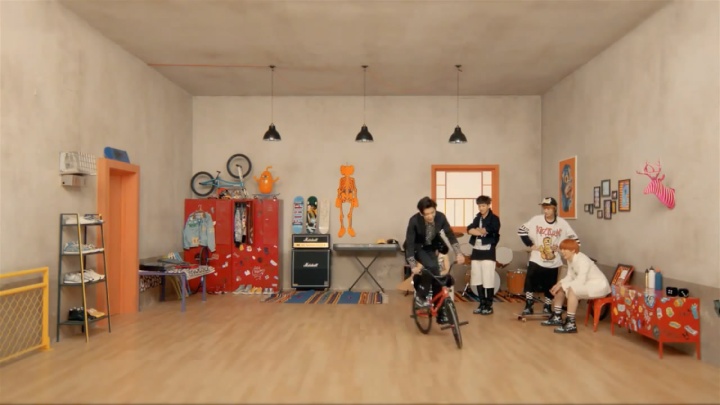 More indoor cycling, but this time on the move, a member of B1A4 rides around the room on a BMX.