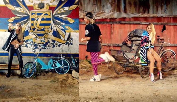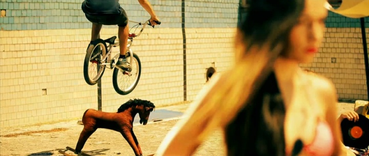 In addition to BMX tricks, this video has Danny Mazo turning up to meet Elena Gheorghe on a delivery bike, but Elena's backup dancers nick some of his cargo!