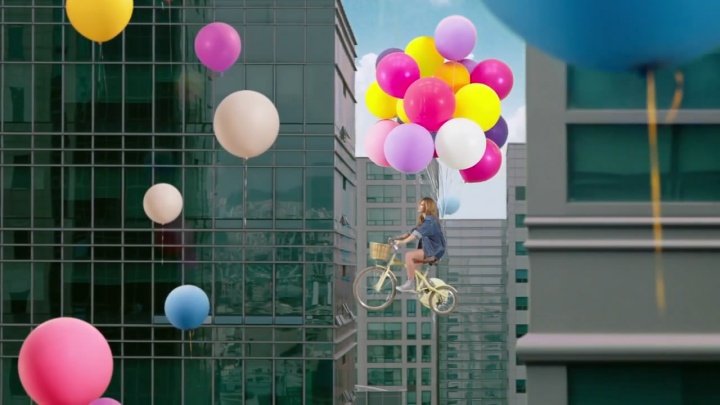 A member of girl group GLAM rides her bike through the air, supported by balloons. Quite where the forward propulsion comes from is not clear.